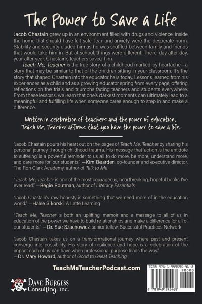 The Power to Save a Life Jacob Chastain grew up in an environment filled with drugs and violence. Inside the home that should have felt safe, fear and anxiety were the desperate norm. Stability and security eluded him as he was shuffled between family and friends that would take him in. But at school, things were different. There, day after day, year after year, Chastain’s teachers saved him. Teach Me, Teacher is the true story of a childhood marked by heartache—a story that may be similar to that of the children sitting in your classroom. It’s the story that shaped Jacob Chastain into the educator he is today. Lessons learned from his experiences as a child and as a growing educator offer reflections on the trials and triumphs facing teachers and students everywhere. From these lessons, we learn that one’s darkest moments can ultimately lead to a meaningful and fulfilling life when someone cares enough to step in and make a difference. Written in celebration of teachers and the power of education, Teach Me, Teacher affirms that you have the power to save a life. "Jacob Chastain pours his heart out on the pages of Teach Me, Teacher by sharing his personal journey through childhood trauma. His message that "action is the antidote to suffering" is a powerful reminder to us all to do more, be more, understand more, and care more for our students." —Kim Bearden, co-founder and executive director, The Ron Clark Academy, author of Talk to Me "Teach Me, Teacher is one of the most courageous, heartbreaking, hopeful books I’ve ever read." —Regie Routman, author of Literacy Essentials "Jacob Chastain’s raw honesty is something that we need more of in the education world." —Halee Sikorski, A Latte Learning "Teach Me, Teacher is both an uplifting memoir and a message to all of us in education of the power we have to build relationships and make a difference for all of our students." —Dr. Sue Szachowicz, senior fellow, Successful Practices Network "Jacob Chastain takes us on a transformational journey where past and present converge into possibility. His story of resilience and hope is a celebration of the impact each of us can have when professional purpose leads the way." —Dr. Mary Howard, author of Good to Great Teaching