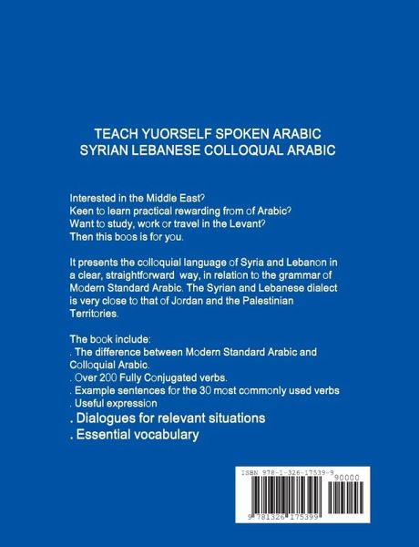TEACH YUORSELF SPOKEN ARABIC SYRIAN LEBANESE COLLOQUAL ARABIC Interested in the Middle East? Keen to learn practical rewarding from of Arabic? Want to study, work or travel in the Levant? Then this boos is for you It presents the colloquial language of Syria and Lebanon in a clear, straightforward way, in relation to the grammar of Modern Standard Arabic. The Syrian and Lebanese dialect is very close to that of Jordan and the Palestinian Territories. The book include: . The difference between Modern Standard Arabic and Colloquial Arabic. . Over 200 Fully Conjugated verbs. . Example sentences for the 30 most commonly used verbs . Useful expression . Dialogues for relevant situations . Essential vocabulary