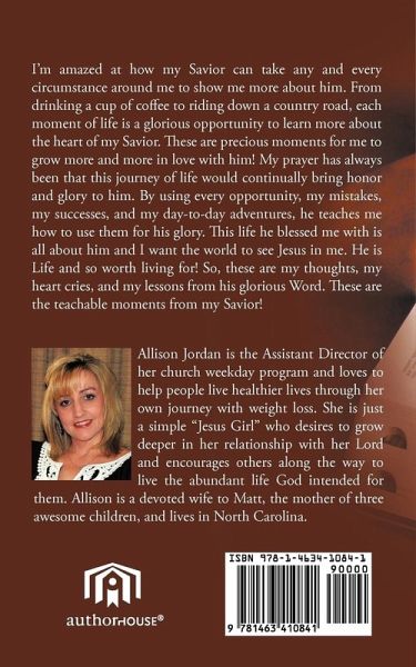 I'm amazed at how my Savior can take any and every circumstance around me to show me more about him. From drinking a cup of coffee to riding down a country road, each moment of life is a glorious opportunity to learn more about the heart of my Savior. These are precious moments for me grow more and more in love with him! My prayer has always been that this journey of life would continually bring honor and glory to him. By using every opportunity, my mistakes, my successes, and my day-to-day adventures, he teaches me how to use them for his glory. This life he blessed me with is all about him and I want the world to see Jesus in me. He is Life and so worth living for! So, these are my thoughts, my heart cries, and my lessons from his glorious Word. These are the teachable moments from my Savior!