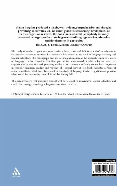 The study of teacher cognition - what teachers think, know and believe - and of its relationship to teachers' classroom practices has become a key theme in the field of language teaching and teacher education. This new in paperback volume provides a timely discussion of the research which now exists on language teacher cognition. The first part of the book considers what is known about the cognitions of pre-service and practicing teachers, and focuses specifically on teachers' cognitions in teaching grammar, reader and writing. The second part of the book evaluates a range of research methods which have been used in the study of language teacher cognition and provides a framework for continuing research in this fascinating field. This comprehensive yet accessible account will be relevant to researchers, teacher educators and curriculum managers working in language education contexts.
