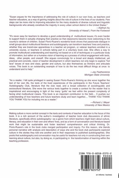 Examines use of ethnically diverse published autobiographies in a teacher educ. book club & course. Focuses on autobiography as site of teacher learning about culture & role of conversation in that learning. Blends personal narrative w/ analysis & descri