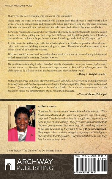 Where you live does not define who you are or who you can be. Those were the words of a wise woman who did not know that she was a teacher or that her words would be remembered and passed on to future generations long after she died. However, this wise woman did know that to make her belief come to fruition, education was the key. For many African Americans who travelled life's highway during the twentieth century, caring teachers were their guiding star, their map, their GPS, and their light through the tunnel. Teachers gave students confidence, hope, determination, knowledge, and a feeling of "yes you can." In this book, the author rejects the idea that anybody can teach and provides clear, distinct criteria for anyone thinking about teaching as a career. The stories she shares also serve as a thank you to all of America's teachers. Discover how African-American teachers have inspired students to succeed and pay it forward with the remarkable stories in Teacher Journeys. We must have outstanding teachers in today's schools. Expectations are key to student performance and teacher success. If teachers have realistic expectations, our kids will try to live up to them. No child wants to be a failure and no good teacher wants their students to fail. -Daisy R. Wright, Teacher Without knowledge and skills, opportunities cease. The burden of developing and imparting the knowledge and skills has been placed squarely upon teachers, regardless of how unfair and lopsided it seems. If anyone is thinking about becoming a teacher, he or she must understand that this profession makes the biggest imprint of any occupation in society. -Verna Cahoon, Principal