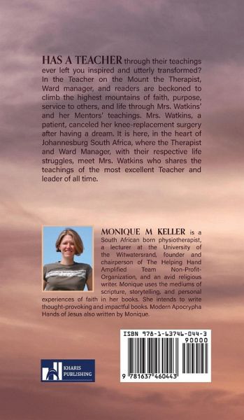 Has a teacher through their teachings ever left you inspired and utterly transformed? In the Teacher on the Mount the Therapist, Ward manager, and readers are beckoned to climb the highest mountains of faith, purpose, service to others, and life through Mrs. Watkins' and her Mentors' teachings. Mrs. Watkins, a patient, canceled her knee-replacement surgery after having a dream. It is here, in the heart of Johannesburg South Africa, where the Therapist and Ward Manager, with their respective life struggles, meet Mrs. Watkins who shares the teachings of the most excellent Teacher and leader of all time. Endorsement: This is a provocative book that takes the reader on an interesting journey through the lives of three women and the inter-related growth in their relationships with each other and most importantly with their Triune God of Father Son and Holy Spirit. It is about 'listening' to God's voice in a modern frenetic world. It is also about dealing with the hardships and challenges of life through our relationship with God. The author simplifies/converts complex issues into understandable concepts and principles using the provocative imagery of mountains as a metaphor to illustrate how we can enhance our ascending relationship with God. She uses everyday life lessons interwoven with relevant and appropriate biblical scriptures which enhance the story. Simply told, the story gives birth to new conceptions of the wonder of our triune God. -Robin Joubert, Honorary Associate Professor at UKZN OT Dept and Lay Minister and licensed preacher at St Thomas Anglican Church Berea, Durban. About the Author: Monique M Keller is a South African born physiotherapist, a lecturer at the University of the Witwatersrand, founder and chairperson of The Helping Hand Amplified Team Non-Profit-Organization, and an avid religious writer. Monique uses the mediums of scripture, storytelling, and personal experiences of faith in her books. She intends to write thought-provoking and impactful books. Modern Apocrypha Hands of Jesus also written by Monique.