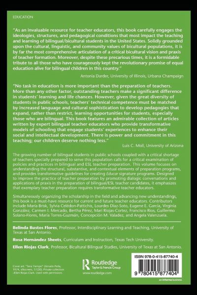The growing number of bilingual students in public schools coupled with a critical shortage of teachers specially prepared to serve this population calls for a critical examination of policies and practices in bilingual and ESL teacher preparation. This volume focuses on understanding the structural, substantive, and contextual elements of preparation programs, and provides transformative guidelines for creating Educar signature programs. Designed to improve the practice of teacher preparation by promoting dialogic conversations and applications of praxis in the preparation of bilingual/ESL teacher candidates, it emphasizes that exemplary teacher preparation requires transformative teacher educators. Simultaneously organizing the scholarship in the field and advancing new understandings, this book is must-have resource for current and future teacher educators. Contributors include Maria Brisk, Sylvia Celédon-Pattichis, Lourdes Diaz-Soto, Eugene García, Virginia Gonzáles, Guillermo Solano-Flores, Maria Torres-Guzman, Carmen Mercado, Bertha Pérez, Mari Riojas-Cortez, Francisco Rios, Concepción Valadez, and Angela Valenzuela.