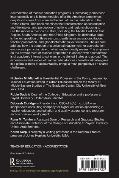 Accreditation of teacher education programs is increasingly embraced internationally and is being modeled after the American experience, despite criticisms from some in the field of teacher education in the United States. This book examines the transformation of accreditation and the interest and perception of nations and regions choosing to use the model in their own culture, including the Middle East and Gulf Region, South America, and the United Kingdom. Its distinctive edge is the juxtaposition of three sectors: quality assurance/accreditation, teacher preparation, and global/international experiences. The authors address how the adoption of a universal requirement for accreditation embraces a particular view of what teacher quality means. The emphasis on the development of teacher preparation in concert with accreditation is of academic interest to scholars in the United States and abroad. The experiences and voices of teacher educators as international colleagues in a global climate of accountability brings a fresh perspective on shared challenges.