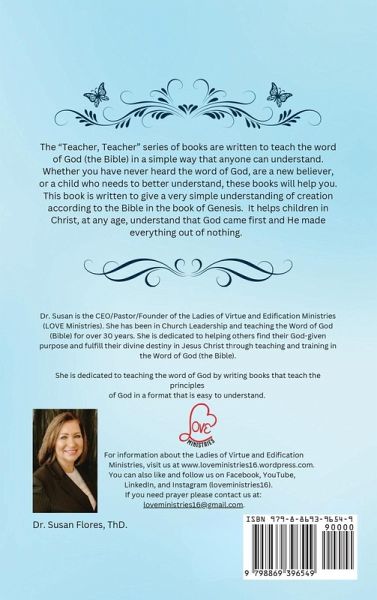 The "Teacher, Teacher" series of books are written to teach the word of God (the Bible) in a simple way that anyone can understand. Whether you have never heard the word of God, are a new believer, or a child who needs to better understand, these books will help you. This book is written to give a very simple understanding of creation according to the Bible in the book of Genesis. It helps children in Christ, at any age, understand that God came first and He made everything out of nothing.