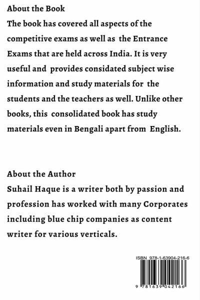 The book has covered all aspects of the competitive exams as well as the Entrance Exams that are held across India. It is very useful and provides considated subject wise information and study materials for the students and the teachers as well. Unlike other books, this consolidated book has study materials even in Bengali apart from English. The study materials covers the following subjects; English, History, Geography, Physics, Chemistry, Biology, Political Science, Computer, Marketing. In short, this book covers all the exams starting from Public Service Commission, Staff Selection Commission, Co-Operative Service Commission, Municipal Service Commission and even the Preliminary Examinations for the Civil Services. The price of the book is just worth it.