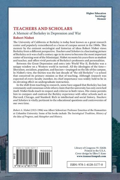 The University of California at Berkeley is today best known as a great research center and popularly remembered as a locus of campus unrest in the 1960s. This memoir by the eminent sociologist and historian of ideas Robert Nisbet views Berkeley from a different perspective. Teachers and Scholars is a fascinating picture of Berkeley as it was a half a century ago in its move to become the most important center of learning west of the Mississippi. Nisbet recounts his years there as student and teacher, and offers vivid portraits of Berkeley's professors and personalities. Between the Great Depression and entry into World War II, Berkeley was a unique window on a Western world in turmoil. All the ideologies of the time-liberalism, socialism, populism, and fascism-impinged on the life of the campus. In Nisbet's view, the thirties was the last decade of "the old Berkeley"-a school that conceived its primary mission as that of teaching. Although research was expected of every faculty member, its chief importance was widely held to be in its elevating effect on undergraduate instruction. In the shift from teaching to research, some have argued that Berkeley has lost community and consensus while others claim that the university has only enriched itself. Nisbet finds much to respect and criticize in both views. His vision permits him to compare and contrast the Berkley experience with other schools such as Harvard, Chicago, and Stanford. Rich in intellectual and social history, Teachers and Scholars is vitally pertinent to the educational questions and controversies of our own time.