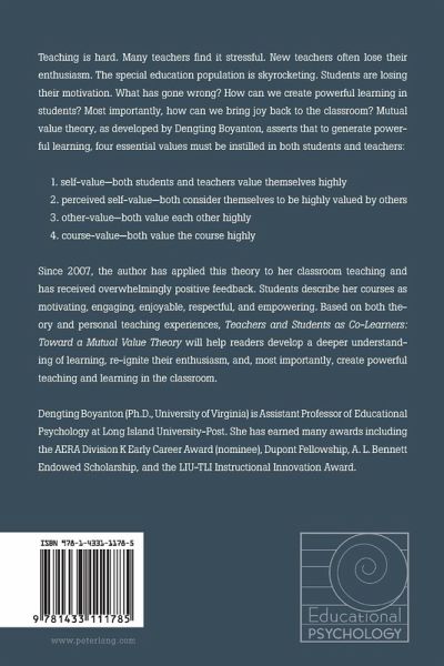 Since 2007, the author has applied this theory to her classroom teaching and has received overwhelmingly positive feedback. Students describe her courses as motivating, engaging, enjoyable, respectful, and empowering. Based on both theory and personal teaching experiences, Teachers and Students as Co-Learners: Toward a Mutual Value Theory will help readers develop a deeper understanding of learning, re-ignite their enthusiasm, and, most importantly, create powerful teaching and learning in the classroom.