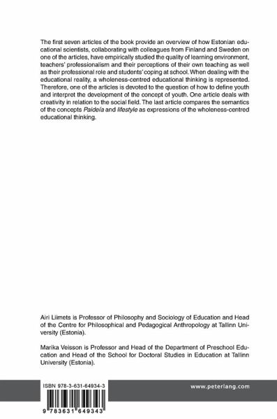 The first seven articles of the book provide an overview of how Estonian educational scientists, collaborating with colleagues from Finland and Sweden on one of the articles, have empirically studied the quality of learning environment, teachers' professionalism and their perceptions of their own teaching as well as their professional role and students' coping at school. When dealing with the educational reality, a wholeness-centred educational thinking is represented. Therefore, one of the articles is devoted to the question of how to define youth and interpret the development of the concept of youth. One article deals with creativity in relation to the social field. The last article compares the semantics of the concepts Paideía and lifestyle as expressions of the wholeness-centred educational thinking.