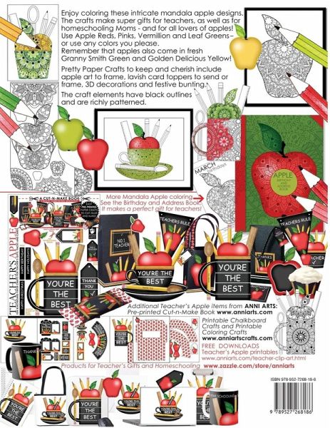 Enjoy coloring these intricate mandala apple designs. The crafts make super gifts for teachers, as well as for homeschooling Moms - and for all lovers of apples! Use Apple Reds, Pinks, Vermillion and Leaf Greens - or use any colors you please. Remember that apples also come in fresh Granny Smith Green and Golden Delicious Yellow! Pretty Paper Crafts to keep and cherish include apple art to frame, lavish card toppers to send or frame, 3D apple decorations, festive bunting and a stocking for heirloom keepsakes to display year after year. The projects make lovely classroom decor too. The Anni Arts craft designs have black outlines and are richly patterned. There is also a coordinating Anni Arts Teacher's Apple Cut-n-Make Book, printable crafts and ready-to-buy products that feature red apples and chalkboard designs. Mandala apples to color are also in a Birthday Book and on printable crafts.