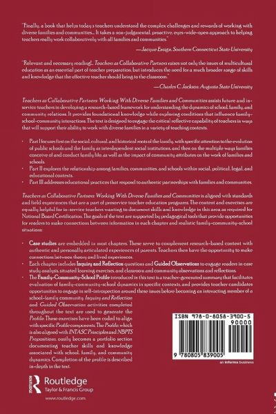Teachers as Collaborative Partners assists future and inservice teachers in developing a research-based framework for understanding the dynamics of school, family, and community relations. It provides foundational knowledge important for understanding families and communities, while exploring conditions that influence family-school-community interactions. The text is designed to engage the critical reflective capability of teachers in ways that will support their ability to work with diverse families in a variety of teaching contexts.Part I focuses first on the social, cultural, and historical roots of the family, with specific attention to the evolution of public schools and the family as interdependent social institutions, and then on the multiple ways families conceive of and conduct family life, as well as the impact of community attributes on the work of families and schools.Part II explores the relationship among families, communities, and schools within social, political, legal, and educational contexts.Part III addresses educational practices that respond to authentic partnerships with families and communities.The goals of the text are supported by pedagogical tools that provide opportunities for readers to make connections between information in each chapter and realistic family-community-school situations.Case Studies are embedded in most chapters. These serve to complement research-based with authentic and personally articulated experiences of parents. Teachers then have the opportunity to make connections between theory and lived experiences.Each chapter includes Inquiry and Reflection questions and Guided Observations to engage readers in case study analysis, situated learning exercises, and classroom and community observations and reflections.The Family-Community-School Profile introduced in this text as a teacher-generated summary allows for evaluation of