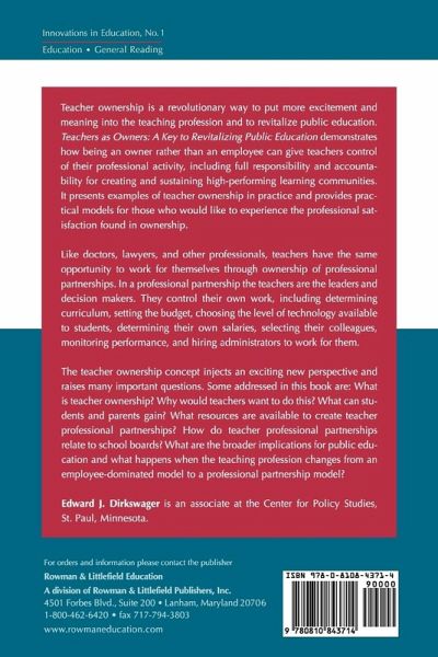 While [others] diagnose the disease, Edward J. Dirkswager's Teachers as Owners provides a cure. Teachers as Owners offers much needed hope for reforming schools in ways that will empower teachers, and ultimately lead to innovations as yet undreamt of. -- Robert Maranto Ncsc Review