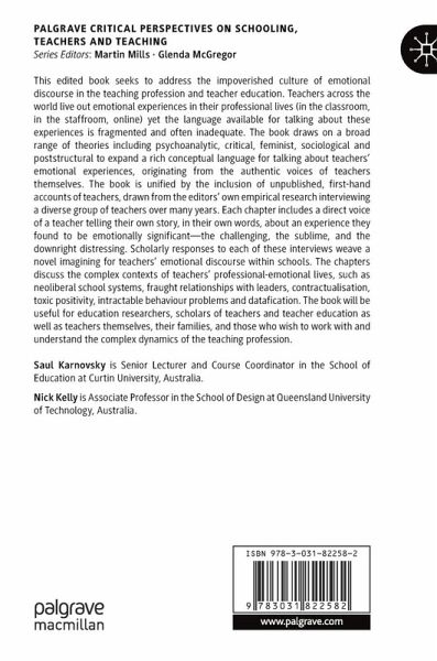 This edited book seeks to address the impoverished culture of emotional discourse in the teaching profession and teacher education. Teachers across the world live out emotional experiences in their professional lives (in the classroom, in the staffroom, online) yet the language available for talking about these experiences is fragmented and often inadequate. The book draws on a broad range of theories including psychoanalytic, critical, feminist, sociological and poststructural to expand a rich conceptual language for talking about teachers' emotional experiences, originating from the authentic voices of teachers themselves. The book is unified by the inclusion of unpublished, first-hand accounts of teachers, drawn from the editors' own empirical research interviewing a diverse group of teachers over many years. Each chapter includes a direct voice of a teacher telling their own story, in their own words, about an experience they found to be emotionally significant-the challenging, the sublime, and the downright distressing. Scholarly responses to each of these interviews weave a novel imagining for teachers' emotional discourse within schools. The chapters discuss the complex contexts of teachers' professional-emotional lives, such as neoliberal school systems, fraught relationships with leaders, contractualisation, toxic positivity, intractable behaviour problems and datafication. The book will be useful for education researchers, scholars of teachers and teacher education as well as teachers themselves, their families, and those who wish to work with and understand the complex dynamics of the teaching profession.