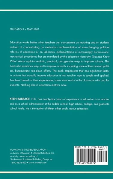 This book explains realistic, practical, genuine ways to improve schools. This book also examines ways not to improve schools including some of the common political, bureaucratic, top-down efforts. The book emphasizes that one significant factor in actions that actually improve education is that teacher input is sought and is applied. Teachers, based on their experiences, know what works in the classroom with and for students. Nothing else in education matters more.