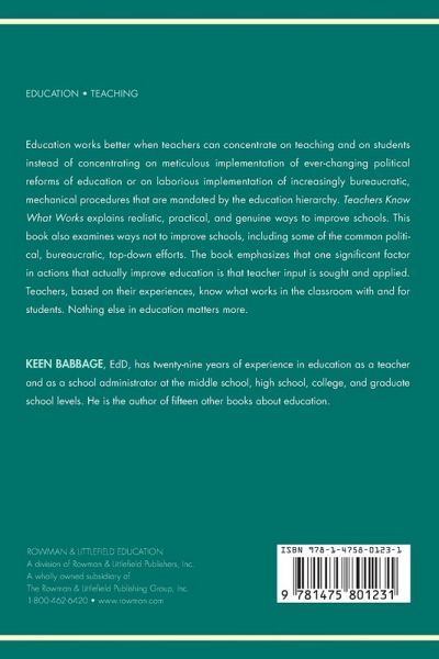 This book explains realistic, practical, genuine ways to improve schools. This book also examines ways not to improve schools including some of the common political, bureaucratic, top-down efforts. The book emphasizes that one significant factor in actions that actually improve education is that teacher input is sought and is applied. Teachers, based on their experiences, know what works in the classroom with and for students. Nothing else in education matters more.