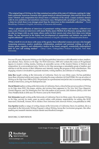 For over 25 years, the journal Writing on the Edge has published interviews with influential writers, teachers, and scholars. Now, Teachers on the Edge: The WOE Interviews, 1989-2017 collects the voices of 39 significant figures in writing studies, forming an accessible survey of the modern history of rhetoric and composition. In a conversational style, Teachers on the Edge encourages a remarkable group of teachers and scholars to tell the stories of their influences and interests, tracing the progress of their contributions. This engaging volume is invaluable to graduate students, writing teachers, and scholars of writing studies.