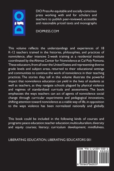 This volume reflects the understandings and experiences of 18 K-12 teachers trained in the histories, philosophies, and practices of nonviolence, after intensive 2-week training at a residential institute coordinated by the Ahimsa Center for Nonviolence at Cal Poly Pomona. These educators, from all over the United States and representing diverse grade levels and subject areas, returned to their educational settings and communities to continue the work of nonviolence in their teaching practices. The stories they tell in this volume illustrate the powerful impact that nonviolence education can yield in the lives of students as well as teachers, as they navigate schools plagued by physical violence and regimes of standardized curricula and assessments. The book emphasizes the ways teachers can act of agents of nonviolence social change through curricular experiments and pedagogical innovations, shifting attention toward nonviolence as a viable way of life, in opposition to the ways violence has been normalized nationally and globally. This book could be included in the following kinds of courses and programs: peace education; teacher education; multiculturalism, diversity and equity courses; literacy; curriculum development; mindfulness.