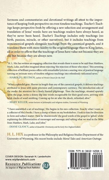 Sermons and commentaries and devotional writings all attest to the importance of keeping fresh perspective on even timeless teachings. Teacher's Teachings keeps perspective fresh by offering a new selection and arrangement and translation of Jesus' words: here are teachings readers have always heard, as they've never been heard. Teacher's Teachings includes only teachings (no birth, passion, miracle, or other narratives), but it includes teachings from noncanonical gospels alongside teachings from the canonical gospels, and it translates them with more fidelity to the original language than to King James, all in order to affirm that the teachings of Jesus have value not because they are old but because they are always new.