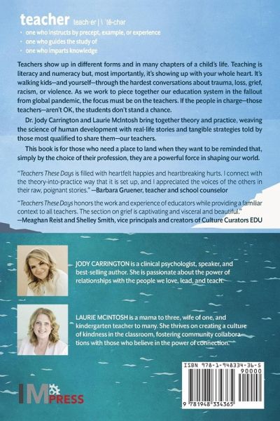 Teachers show up in different forms and in many chapters of a child's life. Teaching is literacy and numeracy but, most importantly, it's showing up with your whole heart. It's walking kids-and yourself-through the hardest conversations about trauma, loss, grief, racism, or violence. As we work to piece together our education system in the fallout from global pandemic, the focus must be on the teachers. If the people in charge-those teachers-aren't OK, the students don't stand a chance. Dr. Jody Carrington and Laurie McIntosh bring together theory and practice, weaving the science of human development with real-life stories and tangible strategies told by those most qualified to share them-our teachers. This book is for those who need a place to land when they want to be reminded that, simply by the choice of their profession, they are a powerful force in shaping our world. "Teachers These Days is filled with heartfelt happies and heartbreaking hurts. I connect with the theory-into-practice way that it is set up, and I appreciated the voices of the others in their raw, poignant stories." -Barbara Gruener, teacher and school counselor "Teachers These Days honors the work and experience of educators while providing a familiar context to all teachers. The section on grief is captivating and visceral and beautiful." -Meaghan Reist and Shelley Smith, vice principals and creators of Culture Curators EDU