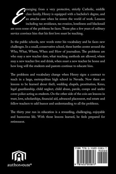 Emerging from a very protective, strictly Catholic, middle class family, Henry is equipped with a bachelor's degree, and an attache case when he enters the world of work. Lessons including tax avoidance, tax evasion, loneliness and blackmail are soon some of the problems he faces. Those plus a few years of military service convince him that his first love must be teaching. In the public schools, new words enter his vocabulary and he faces new challenges. In a small, conservative school, these battles center around the Who, What, Where, When and How of journalism. The problems are who may a new teacher date, what teaching methods are allowed, where may a new teacher live and drink, when must a new teacher be home and how long will the students and parents continue to educate him. The problems and vocabulary change when Henry signs a contract to teach in a large, metropolitan high school in Nevada. Now there are lessons to be learned about theft, wedding chapels, prostitution, Keno, legal guardianship, child neglect, child abuse, parole, comps and under cover police acting as students. On the other side of the coin are lessons in trust, love, scholarships, financial aid, advanced placement, real estate and fellow teachers to add humor and understanding to all the problems. The thirty year run in education is a rewarding, challenging, enjoyable and humorous life. With those lessons learned, he feels prepared for retirement.