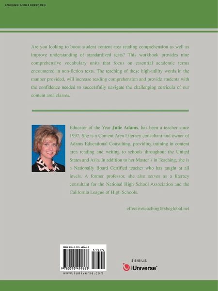 Are you looking to boost student content area reading comprehension as well as improve understanding of standardized tests? This workbook provides nine comprehensive vocabulary units that focus on essential academic terms encountered in non-fiction texts. The teaching of these high-utility words in the manner provided, will increase reading comprehension and provide students with the confidence needed to successfully navigate the challenging curricula of our content area classes.