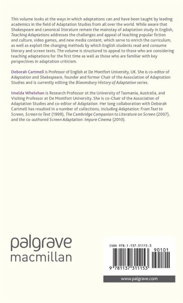 Notes on the contributors 1. A Short History Of Adaptation Studies in The Classroom; Deborah Cartmell and Imelda Whelehan 2. Canons, Critical Approaches, and Contexts; Shelley Cobb 3. The Paragogy of Adaptation in an EFL Context; Laurence Raw 4. Avoiding 'Compare and Contrast': Applied Theory as a Way to Circumvent the 'Fidelity Issue'; Ariane Hudelet 5. Learning to Share: Adaptation Studies and Open Education Resources; Imelda Whelehan and David Sadler 6. Doing Adaptation: The Adaptation as Critic; Kamilla Elliott 7. Teaching Adapting Screenwriters: Adaptation Theory through Creative Practice; Jamie Sherry 8. Out of the Literary Comfort Zone: Adaptation, Embodiment, and Assimilation; Alessandra Raengo 9. 'Adapting' from School to University: Adaptations in the Transition'; Natalie Hayton 10. Coming soon . . . Teaching the Contemporaneous Adaptation; Rachel Carroll 11. Teaching Adaptations Through Marketing: Adaptations And The Language Of Advertising in the1930s; Deborah Cartmell Chronology of Key Publications and Events Select Bibliography Index