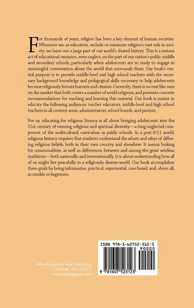 For thousands of years, religion has been a key element of human societies. Whenever we, as educators, exclude or minimize religion's vast role in society, we leave out a large part of our world's shared history. This is a serious act of educational omission, even neglect, on the part of our nation's public middle and secondary schools, particularly when adolescents are so ready to engage in meaningful conversation about the world that surrounds them. Our book's central purpose is to provide middle-level and high school teachers with the necessary background knowledge and pedagogical skills necessary to help adolescents become religiously literate learners and citizens. Currently, there is no text like ours on the market that both covers a number of world religions, and presents concrete recommendations for teaching and learning this material. Our book is meant to educate the following audiences: teacher educators, middle-level and high school teachers in all content areas, administrators, school boards, and parents. For us, educating for religious literacy is all about bringing adolescents into the 21st century of teeming religious and spiritual diversity-a long-neglected component of the multicultural curriculum in public schools. In a post-9/11 world, religious literacy requires that students understand the whats and whys of differing religious beliefs, both in their own country and elsewhere. It means looking for commonalities, as well as differences, between and among the great wisdom traditions-both nationally and internationally. It is about understanding how all of us might live peacefully in a religiously diverse world. Our book accomplishes these goals by being informative, practical, experiential, case-based, and, above all, accessible to beginners.