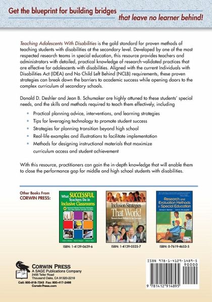 Get the blueprint for building bridges that leave no learner behind! Aligned with the Individuals with Disabilities Education Act and No Child Left Behind Act requirements, this comprehensive guide empowers teachers and administrators with research-validated practices and interventions that can close the general-curriculum performance gap and break down the barriers to academic success for middle and high school students with disabilities. This insightful resource features: Practical planning advice, teaching practices, and learning strategies for inclusive classrooms Methods for designing instructional materials Tips for effectively leveraging technology Strategies for transition beyond high school Real-life examples and illustrations