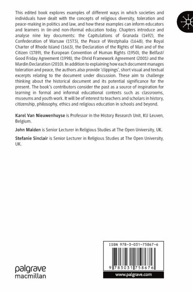 This edited book explores examples of different ways in which societies and individuals have dealt with the concepts of religious diversity, toleration and peace-making in politics and law, and how these examples can inform educators and learners in (in- and non-)formal education today. Chapters introduce and analyse nine key documents: the Capitulations of Granada (1492), the Confederation of Warsaw (1573), the Peace of Westphalia (1648), the Royal Charter of Rhode Island (1663), the Declaration of the Rights of Man and of the Citizen (1789), the European Convention of Human Rights (1950), the Belfast/ Good Friday Agreement (1998), the Ohrid Framework Agreement (2001) and the Mardin Declaration (2010). In addition to explaining how each document manages toleration and peace, the authors also provide 'clippings', short visual and textual excerpts relating to the document under discussion. These aim to challenge thinking about the historical document and its potential significance for the present. The book's contributors consider the past as a source of inspiration for learning in formal and informal educational contexts such as classrooms, museums and youth work. It will be of interest to teachers and scholars in history, citizenship, philosophy, ethics and religious education in schools and beyond.