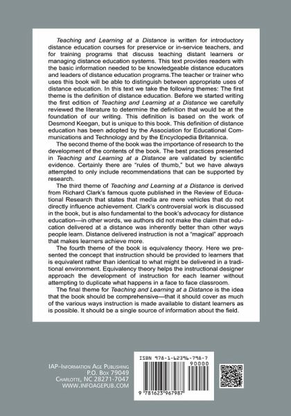Teaching and Learning at a Distance is written for introductory distance education courses for preservice or in-service teachers, and for training programs that discuss teaching distant learners or managing distance education systems. This text provides readers with the basic information needed to be knowledgeable distance educators and leaders of distance education programs. The teacher or trainer who uses this book will be able to distinguish between appropriate uses of distance education. In this text we take the following themes: The first theme is the definition of distance education. Before we started writing the first edition of Teaching and Learning at a Distance we carefully reviewed the literature to determine the definition that would be at the foundation of our writing. This definition is based on the work of Desmond Keegan, but is unique to this book. This definition of distance education has been adopted by the Association for Educational Communications and Technology and by the Encyclopedia Britannica. The second theme of the book was the importance of research to the development of the contents of the book. The best practices presented in Teaching and Learning at a Distance are validated by scientific evidence. Certainly there are "rules of thumb", but we have always attempted to only include recommendations that can be supported by research. The third theme of Teaching and Learning at a distance is derived from Richard Clark's famous quote published in the Review of Educational Research that states that media are mere vehicles that do not directly influence achievement. Clark's controversial work is discussed in the book, but is also fundamental to the book's advocacy for distance education - in other words, we authors did not make the claim that education delivered at a distance was inherently better than other ways people learn. Distance delivered instruction is not a "magical" approach that makes learners achieve more. The fourth theme of the book is equivalency theory. Here we presented the concept that instruction should be provided to learners that is equivalent rather than identical to what might be delivered in a traditional environment. Equivalency theory helps the instructional designer approach the development of instruction for each learner without attempting to duplicate what happens in a face to face classroom. The final theme for Teaching and Learning at a Distance is the idea that the book should be comprehensive - that it should cover as much of the various ways instruction is made available to distant learners as is possible. It should be a single source of information about the field.