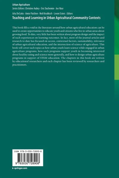 Chapter 1. An Introduction of Teaching and Learning in Urban Agricultural Community Contexts (Neil Knobloch).- Chapter 2. Community as curriculum: Dewey's Theory of Inquiry in the Context of an Urban Agriculture Project (Mihye Won and Bertram C. Bruce).- Chapter 3. Forging Research Pathways to Sustainable Farms and Food Systems with an Interdisciplinary Evaluative Framework for Urban Agriculture (Helena K. Farrell).- Chapter 4. Engaging Nashville's Youth in Farming, Food Choice, and Food Access Issues: Two Programs by a Nashville Nonprofit (Michelle Wooten and Josh Corlew).- Chapter 5. Resurfacing Environmental Identity in Coastal Peru (Daniela Benavides and Adriana Gonzalez-Pestana).- Chapter 6. Permaculture in Action : Urban Farming as Continual Science Learning (Zev H. S. Friedman and Phyllis Katz).- Chapter 7. Learning to Become "Good Food" Educators: Practices and Program Development of an Urban Agriculture Education Organization (Christopher D. Murakami and Heather Gillich).- Chapter 8. The USDA Future Scientists Urban Agriculture Program (Craig Wilson, Carolyn Schroeder, and Timothy Scott).- Chapter 9. Forging the Farm-To-School Connection: Articulating the Vision Behind Food-Based Environmental Education at the Dalton School (Kevin Slick and Mila Tewell).- Chapter 10. Urban Beekeeping as a Tool for STEAM Education (Thomas Schmitt, Kristian Demary, and Noah Wilson-Rich).