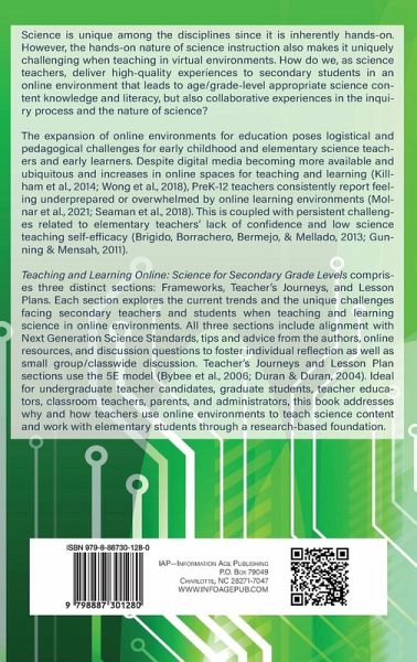 Science is unique among the disciplines since it is inherently hands-on. However, the hands-on nature of science instruction also makes it uniquely challenging when teaching in virtual environments. How do we, as science teachers, deliver high-quality experiences to secondary students in an online environment that leads to age/grade-level appropriate science content knowledge and literacy, but also collaborative experiences in the inquiry process and the nature of science? The expansion of online environments for education poses logistical and pedagogical challenges for early childhood and elementary science teachers and early learners. Despite digital media becoming more available and ubiquitous and increases in online spaces for teaching and learning (Killham et al., 2014; Wong et al., 2018), PreK-12 teachers consistently report feeling underprepared or overwhelmed by online learning environments (Molnar et al., 2021; Seaman et al., 2018). This is coupled with persistent challenges related to elementary teachers' lack of confidence and low science teaching self-efficacy (Brigido, Borrachero, Bermejo, & Mellado, 2013; Gunning & Mensah, 2011). Teaching and Learning Online: Science for Secondary Grade Levels comprises three distinct sections: Frameworks, Teacher's Journeys, and Lesson Plans. Each section explores the current trends and the unique challenges facing secondary teachers and students when teaching and learning science in online environments. All three sections include alignment with Next Generation Science Standards, tips and advice from the authors, online resources, and discussion questions to foster individual reflection as well as small group/classwide discussion. Teacher's Journeys and Lesson Plan sections use the 5E model (Bybee et al., 2006; Duran & Duran, 2004). Ideal for undergraduate teacher candidates, graduate students, teacher educators, classroom teachers, parents, and administrators, this book addresses why and how teachers use online environments to teach science content and work with elementary students through a research-based foundation.