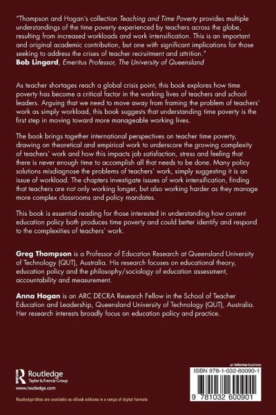 As teacher shortages reach a global crisis point, this book explores how time poverty is a critical factor in the lives of teachers and school leaders. Arguing that we must cease framing the problem of teachersâ work as simply workload, this book suggests that understanding time poverty is essential to foster more manageable working lives.