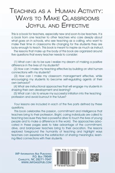 This is a book for teachers, especially new and soon-to-be teachers. It's a book from one teacher to other teachers who care deeply about what goes on in schools, who see teaching as a calling, who want to make their time in classrooms life changing for the students they are lucky enough to teach. This book is meant to inspire as much as instruct. The lessons that make up the body of this book are organized around five questions that every teacher needs to consider: (1) What can I do to be sure I realize my dream of making a positive difference in the lives of my students? (2) How can I make my teaching effective by building on vital human connections with my students? (3) How can I make my classroom management effective, while encouraging my students to become self-regulating agents of their own behavior? (4) What are instructional approaches that will engage my students in shaping their own development and learning? (5) What can I do to ensure my successful initiation into the teaching profession and avoid burnout in the future? Four lessons are included in each of the five parts defined by these questions. This book celebrates the passion, commitment and intelligence that teachers bring to their profession. Bright, caring individuals are called to teaching because they feel a powerful drive to touch the lives of young people and to make a difference in the world. The approaches advocated in these pages seek to take advantage of the commitment, drive, and brainpower teachers bring to their avocation. The lessons explored foreground the humanity of teaching and highlight ways teachers can experience the satisfaction of sharing meaningful, learning-filled connections with their students.