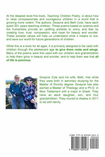 At the deepest level this book, Teaching Children Poetry, is about how to raise compassionate and courageous children in a world that is growing more violent. The authors, Dwayne and Beth Cole, have each spent 50+ years teaching children. These poems basedon science and the humanities provide an uplifting antidote to worry and fear by creating love, trust, compassion, and hope for beauty and wonder. These societal values will help us understand what it means to live, and save our world for future generations of children. While this is a book for all ages, it is primarily designed to be used with children through the adolescent age to give them roots and wings. Many of the poems were first used with our children and grandchildren to help them grow in beauty and wonder, and to help them see that all of life is precious. At the deepest level this book, Teaching Children Poetry, is about how to raise compassionate and courageous children in a world that is growing more violent. The authors, Dwayne and Beth Cole, have each spent 50+ years teaching children. These poems basedon science and the humanities provide an uplifting antidote to worry and fear by creating love, trust, compassion, and hope for beauty and wonder. These societal values will help us understand what it means to live, and save our world for future generations of children. While this is a book for all ages, it is primarily designed to be used with children through the adolescent age to give them roots and wings. Many of the poems were first used with our children and grandchildren to help them grow in beauty and wonder, and to help them see that all of life is precious.