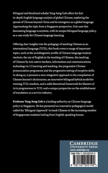 1. The spread of Chinese as a global language; 2. Mandarin Chinese as spoken in mainland China, Taiwan, Hong Kong and Singapore: a comparison; 3. Hard truths about Chinese language policy and planning in Singapore; 4. A sociolinguistic profile of Chinese language student-teachers in Singapore; 5. Who are we? The China complex of Chinese in Singapore; 6. The use of English in the teaching of Chinese: making the most of the learner's linguistic resources; 7. The teaching of Chinese by non-native teachers: experience and implications; 8. ICT in L2 learning and teaching: design and development of bilingual digital instructional materials; 9. Internet Plus and TCIL: a progressive Chinese pronunciation programme; 10. From bilingual to monolingual: a new business Chinese test for the progressive testing of receptive skills; 11. The four language skills and the compilation of Chinese learner's dictionaries: an integrative approach; 12. The bilingual hybrid teacher model for teaching Chinese as an international language; 13. The master of arts in teaching Chinese as an international language; 14. The making of the translation service industry in Singapore; Epilogue.