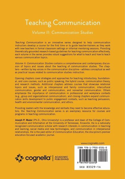 Teaching Communication is an innovative series designed to help communication instructors develop a course for the first time or to guide teacher-trainers as they work with new teachers in formal classroom settings or informal mentoring sessions. Providing theoretically grounded research-based guidelines for teaching communication effectively, each volume in the series provides robust suggestions for what to teach and how to teach various communication topics. Volume II: Communication Studies contains a comprehensive and contemporary discussion of topics and issues about the teaching of communication studies. The chapters-written by key voices in the communication discipline-address conceptual as well as practical issues related to communication studies instruction. Opening chapters cover strategies and approaches for teaching introductory, foundational, and core courses, such as public speaking, the hybrid course, communication theory, and research methods. Additional chapters address courses that showcase relational topics and issues, such as interpersonal and family communication, intercultural communication, gender and communication, and nonverbal communication. Others emphasize the importance of communication in professional and workplace contexts (e.g., group and organizational communication), and closing chapters expand communication skills development to public engagement contexts, such as teaching persuasion, health and environmental communication, and ethics. Providing readers with the knowledge and skillsets they need to become effective educators, the Teaching Communication series is an exemplary resource for courses and programs in teaching communication.