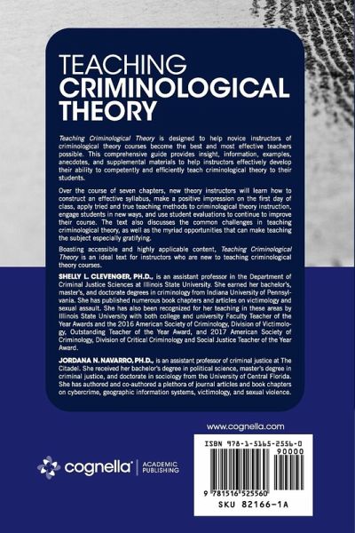 Teaching Criminological Theory is designed to help novice instructors of criminological theory courses become the best and most effective teachers possible. This comprehensive guide provides insight, information, examples, anecdotes, and supplemental materials to help instructors effectively develop their ability to competently and efficiently teach criminological theory to their students. Over the course of seven chapters, new theory instructors will learn how to construct an effective syllabus, make a positive impression on the first day of class, apply tried and true teaching methods to criminological theory instruction, engage students in new ways, and use student evaluations to continue to improve their course. The text also discusses the common challenges in teaching criminological theory, as well as the myriad opportunities that can make teaching the subject especially gratifying. Boasting accessible and highly applicable content, Teaching Criminological Theory is an ideal text for instructors who are new to teaching criminological theory courses. Shelly L. Clevenger, Ph.D., is an assistant professor in the Department of Criminal Justice Sciences at Illinois State University. She earned her bachelor’s, master’s, and doctorate degrees in criminology from Indiana University of Pennsylvania. She has published numerous book chapters and articles on victimology and sexual assault. She has also been recognized for her teaching in these areas by Illinois State University with both college and university Faculty Teacher of the Year Awards and the 2016 American Society of Criminology, Division of Victimology, Outstanding Teacher of the Year Award, and 2017 American Society of Criminology, Division of Critical Criminology and Social Justice Teacher of the Year Award. Catherine D. Marcum, Ph.D., graduated from Indiana University in Pennsylvania in 2008 with a Ph.D. in criminology. She has published over 50 peer-reviewed journals articles and authored and/or edited over 10 books. Her areas of expertise include cybercrime offending and victimization, correctional issues, and sexual victimization. She is currently the assistant chair of her department, and the editor of Corrections: Policy, Practice, and Research. Jordana Navarro, Ph.D., is an assistant professor of criminal justice at The Citadel. She received her bachelor’s degree in political science, master’s degree in criminal justice, and doctorate in sociology from the University of Central Florida. She has authored and co-authored a plethora of journal articles and book chapters on cybercrime, geographic information systems, victimology, and sexual violence. Other Cognella titles by Catherine D. Marcum: Teaching Introduction to Policing (First Edition) A Guide to Graduate School Success for Criminal Justice, Public Safety, and Administration of Justice Students (First Edition)