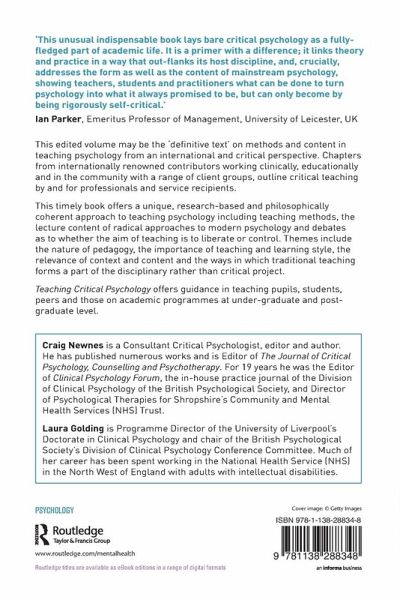 This edited volume may be the 'definitive text' on methods and content in teaching psychology from an international and critical perspective. Chapters from internationally renowned contributors working clinically, educationally and in the community with a range of client groups, outline critical teaching by and for professionals and service recipients. This timely book offers a unique, research-based and philosophically coherent approach to teaching psychology including teaching methods, the lecture content of radical approaches to modern psychology and debates as to whether the aim of teaching is to liberate or control. Themes include the nature of pedagogy, the importance of teaching and learning style, the relevance of context and content and the ways in which traditional teaching forms a part of the disciplinary rather than critical project. Teaching Critical Psychology offers guidance in teaching pupils, students, peers and those on academic programmes at under-graduate and post-graduate level.