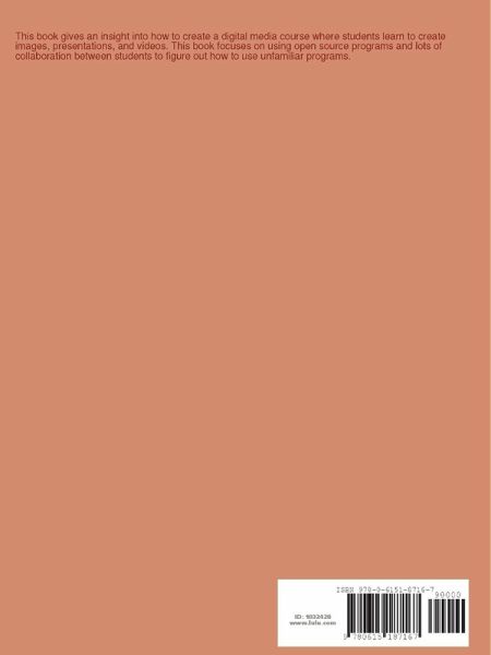 This book gives an insight into how to create a digital media course where students learn to create images, presentations, and videos. This book focuses on using open source programs and lots of collaboration between students to figure out how to use unfamiliar programs.
