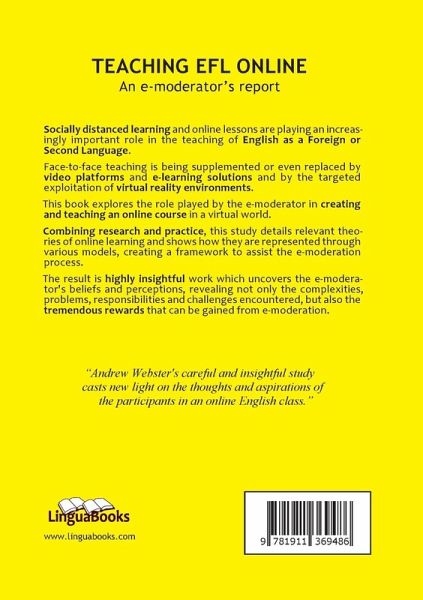 Socially distanced learning and online lessons are playing an increasingly important role in the teaching of English as a Foreign or Second Language. Face-to-face teaching is being supplemented or even replaced by video platforms and e-learning solutions and by the targeted exploitation of virtual reality environments. This book explores the role played by the e-moderator in creating and teaching an online course in a virtual world. Combining research and practice, this study details relevant theories of online learning and shows how they are represented through various models, creating a framework to assist the e-moderation process. The result is highly insightful work which uncovers the e-moderator's beliefs and perceptions, revealing not only the complexities, problems, responsibilities and challenges encountered, but also the tremendous rewards that can be gained from e-moderation.