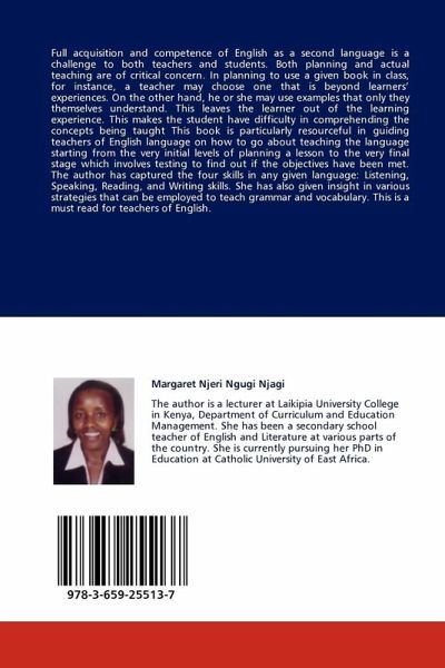 Full acquisition and competence of English as a second language is a challenge to both teachers and students. Both planning and actual teaching are of critical concern. In planning to use a given book in class, for instance, a teacher may choose one that is beyond learners' experiences. On the other hand, he or she may use examples that only they themselves understand. This leaves the learner out of the learning experience. This makes the student have difficulty in comprehending the concepts being taught This book is particularly resourceful in guiding teachers of English language on how to go about teaching the language starting from the very initial levels of planning a lesson to the very final stage which involves testing to find out if the objectives have been met. The author has captured the four skills in any given language: Listening, Speaking, Reading, and Writing skills. She has also given insight in various strategies that can be employed to teach grammar and vocabulary. This is a must read for teachers of English.