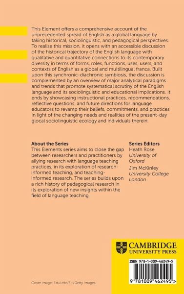 This Element offers a comprehensive account of the unprecedented spread of English as a global language by taking historical, sociolinguistic, and pedagogical perspectives. To realize this mission, it opens with an accessible discussion of the historical trajectory of the English language with qualitative and quantitative connections to its contemporary diversity in terms of forms, roles, functions, uses, users, and contexts of English as a global and multilingual franca. Built upon this synchronic-diachronic symbiosis, the discussion is complemented by an overview of major analytical paradigms and trends that promote systematical scrutiny of the English language and its sociolinguistic and educational implications. It ends by showcasing instructional practices, recommendations, reflective questions, and future directions for language educators to revamp their beliefs, commitments, and practices considering the changing needs and realities of the present-day global sociolinguistic ecology and individuals therein.