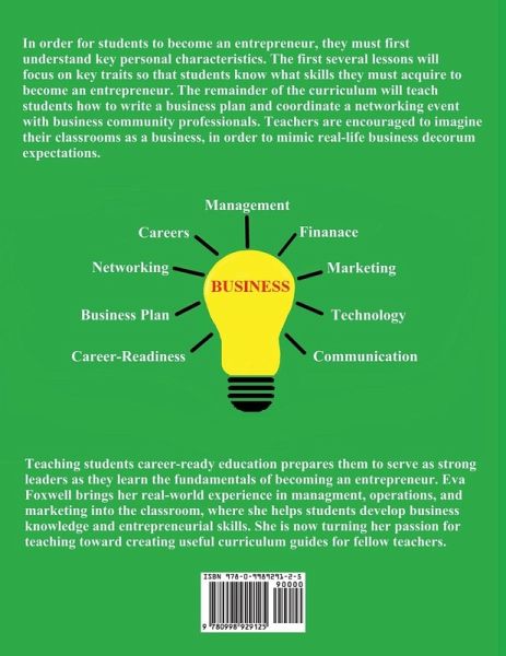 Teaching Entrepreneurship is a curriculum guide for new and experienced instructors who want a structured yet flexible outline for teaching in Business and Technology. Eva Marie Foxwell’s lessons are designed with a focus on giving teachers dynamic and interactive lessons, guided learning ideas, detailed assignments, formative and summative assessments, and a wealth of classroom material. For students, this curriculum guide is designed to provide space to think, reflect, create, and collaborate toward formal projects that engage real-world business expectations. Each lesson comes with step-by-step activity guides, classroom management tips, sections to customize, and questions for teacher reflection. Lessons are designed to give teachers activities, materials, and scaffolded learning toward a major assignment, for the duration of one class period of either 50 or 75 minutes, depending on your school’s schedule. However, teachers may expand, contract, or omit components as they see fit. One lesson may take 1 class period or 1 week, depending on your scheduling needs or student ability. Each lesson is three pages long. The first Lesson page contains a Lesson Overview, a space for you to write any specific announcements or reminders, list of required materials, list of the lesson’s objectives, and suggested learning accommodations. The second Lesson page contains a a step-by-step activity and discussion guide, synthesis activity or questions, and formative assessment questions. The final lesson page is a teacher reflection space, with questions for your own reflection after the lesson has ended, and space for your own notes and action items. Lessons can be used directly from the book, or photocopied.