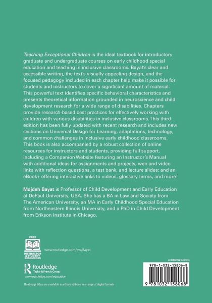 Part I: Foundations of Early Childhood Inclusive and Special Education 1. Education of Children with Disabilities: An Introduction to the Field 2. Inclusive Education: Current Issues and Methods of Intervention in Early Childhood 3. Atypical Development 4. Families are the Most Important of All 5. Identification and Assessment 6. Developing IFSP and IEP Part II: Learning and Behavior Characteristics of Disabilities, and Best Practices 7. Children on the Autism Spectrum Disorder (ASD) 8. Children Who Have Attention Deficit Hyperactivity Disorder 9. Children Who Need Mental Health Support 10. Children with Communication Disorders 11. Children With Intellectual Disability 12. Children with Hearing Loss and Visual Impairment 13. Children Who Have Motor Issues and Other Health Impairments Part III: Kindergarten Through Third Grade 14. Education of Children with Disabilities in Primary School Years - Grades K-3