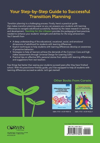 Your step-by-step guide to successful transition planning Finally, here's a practical guide that makes transition planning easier. Backed by the latest research in learning and development, Teaching for the Lifespan provides you with the pedagogical best practices to promote your students' strengths for life-long success. You'll benefit from: A deep understanding of the educational, vocational, social, and emotional dimensions of adulthood for students with learning differences Techniques to help students with learning differences develop an awareness of proactive behaviors Strategies to help all learners achieve the demands of the Common Core and high-stakes assessments through Universal Design for Learning (UDL)