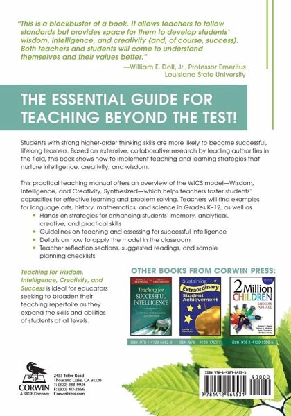 'This is a blockbuster of a book. It allows teachers to follow standards, but provides space for them to develop students' wisdom, intelligence, and creativity (and of course success). Both teachers and students will come to understand themselves and their values better.' -William E. Doll, Jr., Professor Emeritus Louisiana State University The essential guide for teaching beyond the test! Students with strong higher-order thinking skills are more likely to become successful, lifelong learners. Based on extensive, collaborative research by leading authorities in the field, this book shows how to implement teaching and learning strategies that nurture intelligence, creativity, and wisdom. This practical teaching manual offers an overview of the WICS model-Wisdom, Intelligence, Creativity, Synthesized-which helps teachers foster students' capacities for effective learning and problem solving. Teachers will find examples for language arts, history, mathematics, and science in Grades K-12, as well as: - Hands-on strategies for enhancing students' memory, analytical, creative, and practical skills - Guidelines on teaching and assessing for successful intelligence - Details on how to apply the model in the classroom - Teacher reflection sections, suggested readings, and sample planning checklists Teaching for Wisdom, Intelligence, Creativity, and Success is ideal for educators seeking to broaden their teaching repertoire as they expand the skills and abilities of students at all levels.