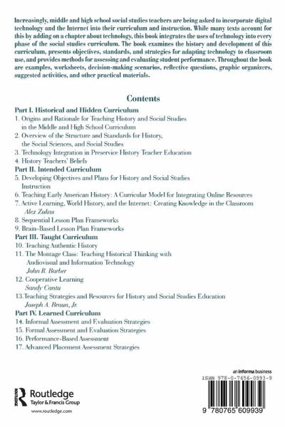 Preface Part I Historical and Hidden Curriculum Chapter 1 Origins and Rationale for Teaching History and the Social Studies in the Middle and High School Curriculum Chapter 2 Overview of the Structure and Standards for History, the Social Sciences, and Social Studies Chapter 3 Technology Integration in Preservice History Teacher Education Chapter 4 History Teachers' Beliefs Part II Intended Curriculum Chapter 5 Developing Objectives and Plans for History and Social Studies Instruction Chapter 6 Teaching Early American History: A Curricular Model for Integrating Online Resources Chapter 7 Active Learning, World History, and the Internet: Creating Knowledge in the Classroom Part III Sequential Lesson Plan Frameworks Chapter 8 Brain-Based Lesson Plan Frameworks Chapter 9 Taught Curriculum Chapter 10 Teaching Authentic History Chapter 11 The Montage Class: Teaching Historical Thinking with Audiovisual and Information Technology Chapter 12 Cooperative Learning Chapter 13 Teaching Strategies and Resources for History and Social Studies Education Part IV Learned Curriculum Chapter 14 Informal Assessment and Evaluation Strategies Chapter 15 Formal Assessment and Evaluation Strategies Chapter 16 Performance-Based Assessment Chapter 17 Advanced Placement Assessment Strategies