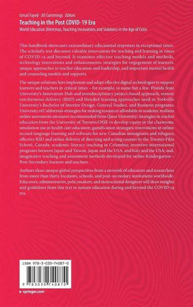 This handbook showcases extraordinary educational responses in exceptional times. The scholarly text discusses valuable innovations for teaching and learning in times of COVID-19 and beyond. It examines effective teaching models and methods, technology innovations and enhancements, strategies for engagement of learners, unique approaches to teacher education and leadership, and important mental health and counseling models and supports.